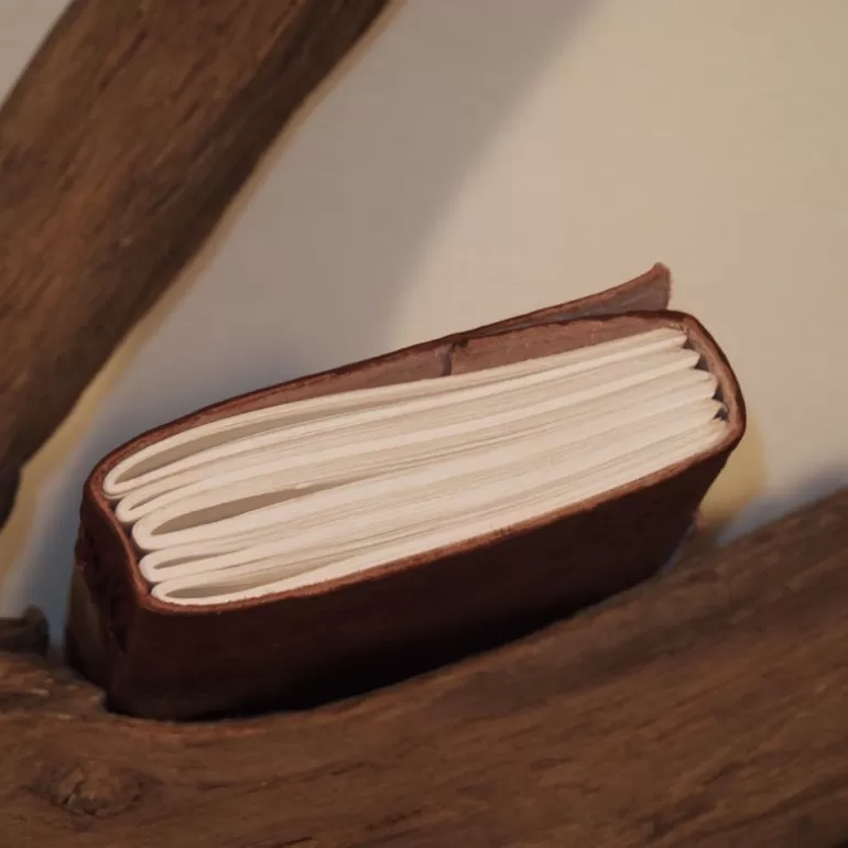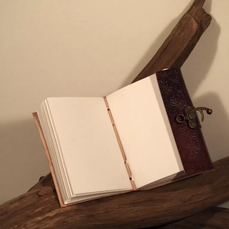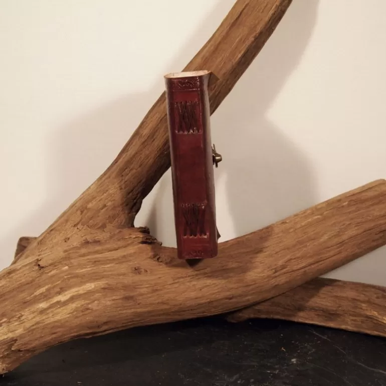 Sa couverture en cuir est ornée de motifs pressés : un Arbre de vie et des symboles géométriques. Il se ferme avec un crochet en laiton et compte 100 pages de papier recyclé de coton, l’équivalent d’un papier à dessin 120g de qualité. Il peut servir de , carnet de voyage, cahier d’écriture, livre d’or ou de carnet secret.